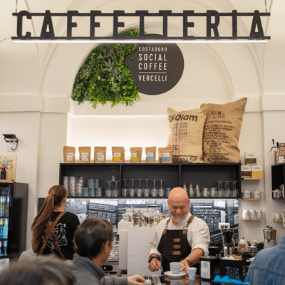 Costadoro Social Coffee Vercelli (“il Social” per gli amici) è una rivisitazione in chiave contemporanea di un classico salotto letterario che si colloca all’interno di un più ampio progetto di Cooperativa Sociale 181: un piano di utilità sociale che ha l’obiettivo di creare a Vercelli un luogo di socialità e inclusività, dove fare cultura su temi come l’inclusione di persone disabili in ambienti lavorativi ad alto contributo prestazionale, la cittadinanza attiva dei giovani, i prodotti eticamente sostenibili e la responsabilità sociale d’impresa.